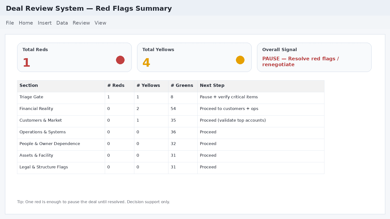 Instantly see your signal: Proceed / Proceed With Conditions / Pause / Walk Away across 200+ checkpoints.