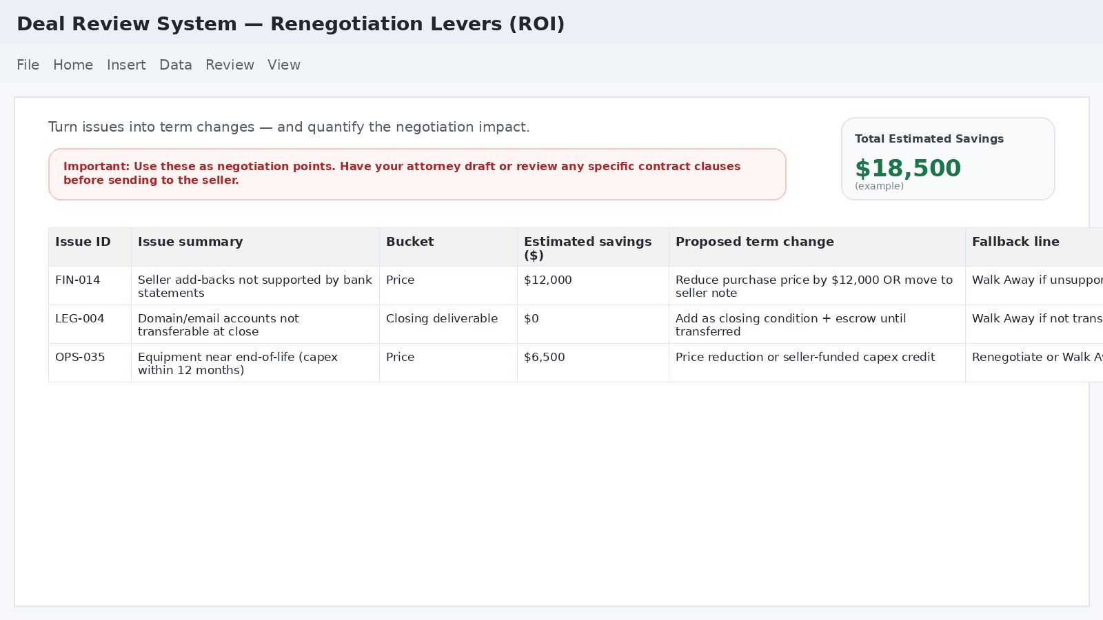 Translate risks into renegotiation terms and track Estimated Savings + Total Savings so the tool pays for itself.